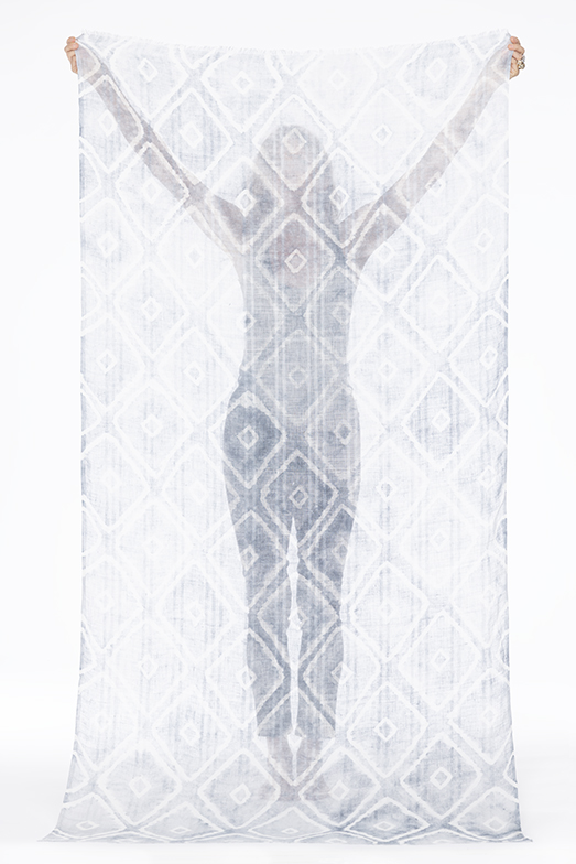 - LINEN DIAMONDS & FLOWERS SHAWL IN CHAMBRAY & IVORY 100% LINEN, HAND TIE-DYED